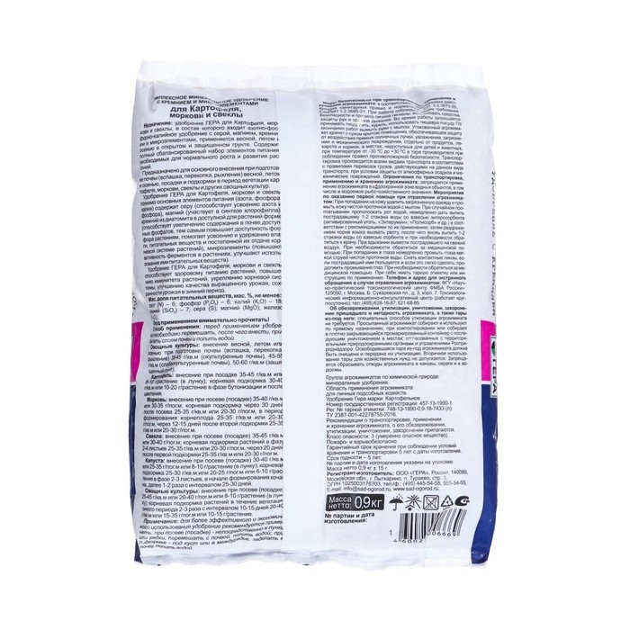 Удобрение "ГЕРА" для Картофеля, моркови и свеклы, с диатомитом, 0,9 кг