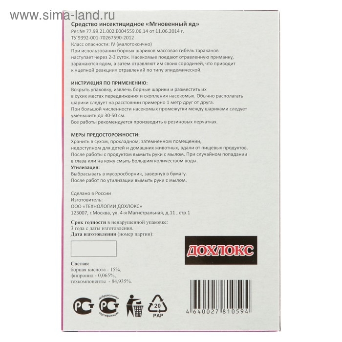 При использовании борных шариков «Дохлокс» массовая гибель тараканов наступает через 5‒7 суток. Насекомые поедают приманку, заражаются ядом, а затем отравляют им своих сородичей, что приводит к цепной реакции по типу эпидемической.Инструкция по применению: Вскрыть упаковку, извлечь борные шарики и разместить их в сухих точках скопления и передвижения тараканов. Располагать их следует на расстоянии примерно 1 м друг от друга. При большой численности насекомых промежутки следует уменьшить до 30‒50 см. Все работы рекомендуется производить в резиновых перчатках.Меры предосторожности: Хранить в сухом, прохладном, затемнённом помещении, недоступном для детей и домашних животных, вдали от пищевых продуктов. После работы со средством вымыть руки с мылом. При попадании в глаза или на кожу смыть большим количеством воды.Утилизация: Выбрасывать в мусоросборник, завернув в бумагу. После работ по утилизации вымыть руки с мылом.Состав: борная кислота (15 %), фипронил (0,065 %), техкомпоненты (84,935 %).