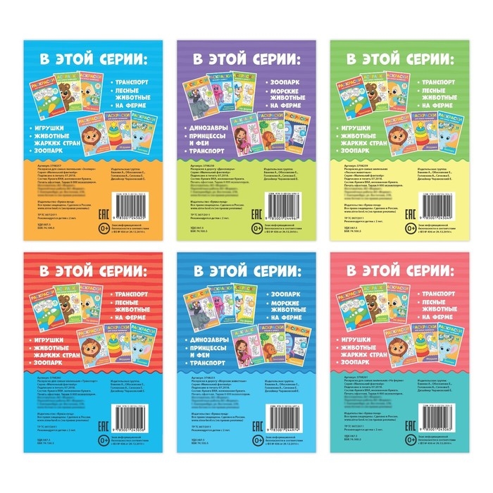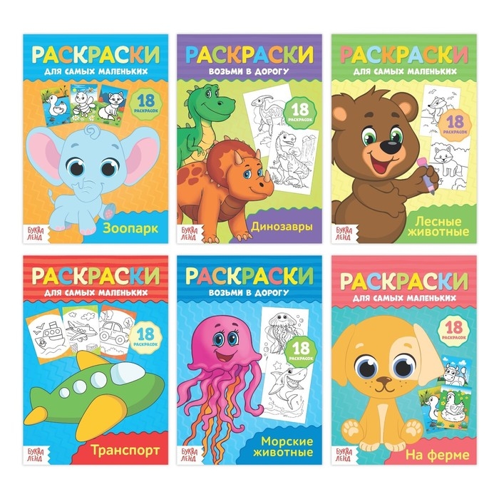 С серией раскрасок для самых маленьких ребёнок познакомится с лесными зверьми, животными Африки, обитателями фермы, а также изучит и разрисует основные виды транспорта.