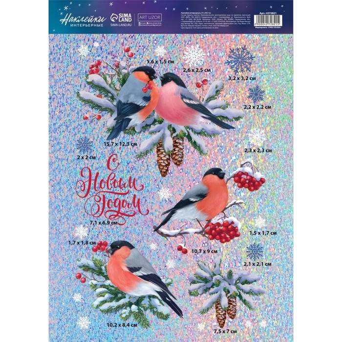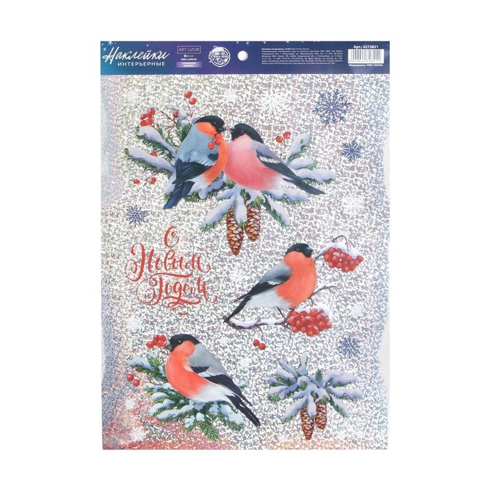 Наклейки новогодние, интерьерные —голография «Снегири», 21 х 29.7 см, Новый год