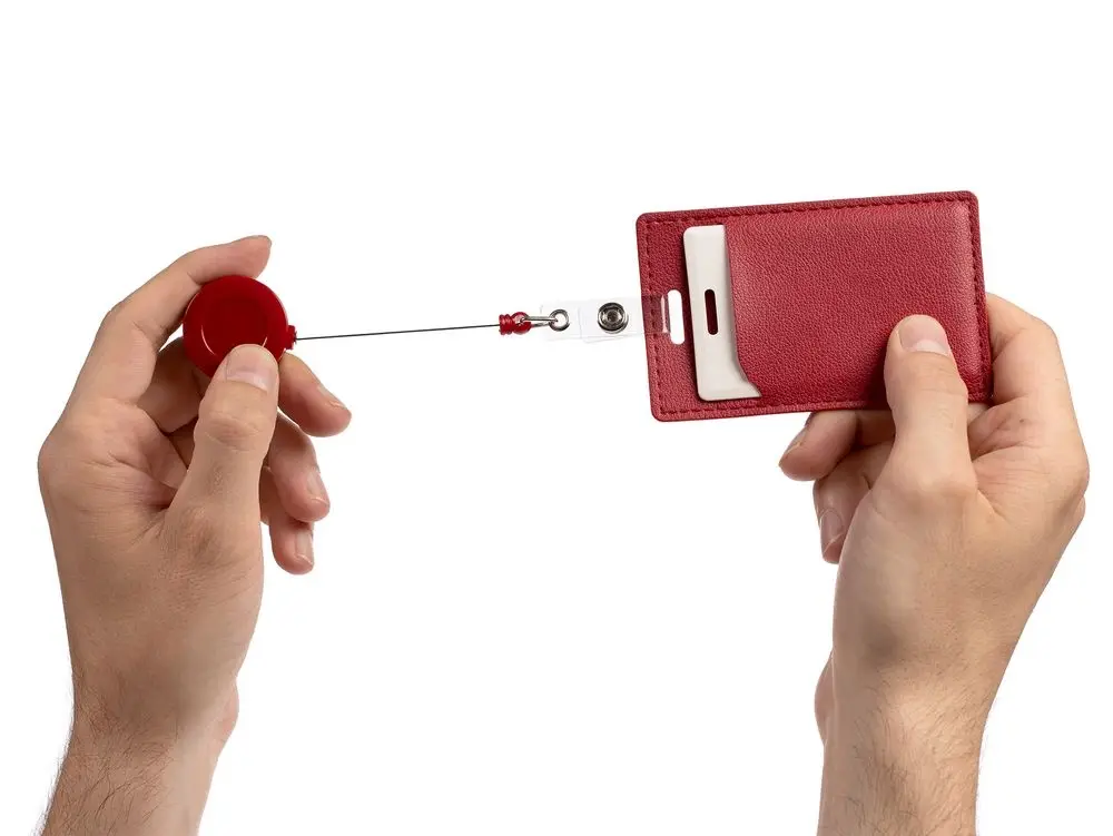 Ретрактор крепится к одежде, а с другой стороны можно поместить бейдж, визитку или магнитную карту. В корпусе спрятан сворачивающийся шнур, который позволяет при необходимости демонстрировать содержимое держателя, не снимая его.