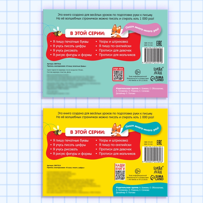 Многоразовые прописи «Пиши-стирай. Пишем буквы и цифры» — отличный способ для ребёнка освоить навыки письма в увлекательной форме. В комплекте 2 прописи по 12 страниц с заданиями и специальный маркер, который позволяет многократно стирать написанное и начинать заново. Это отличное решение для малышей, которые только начинают учиться писать.