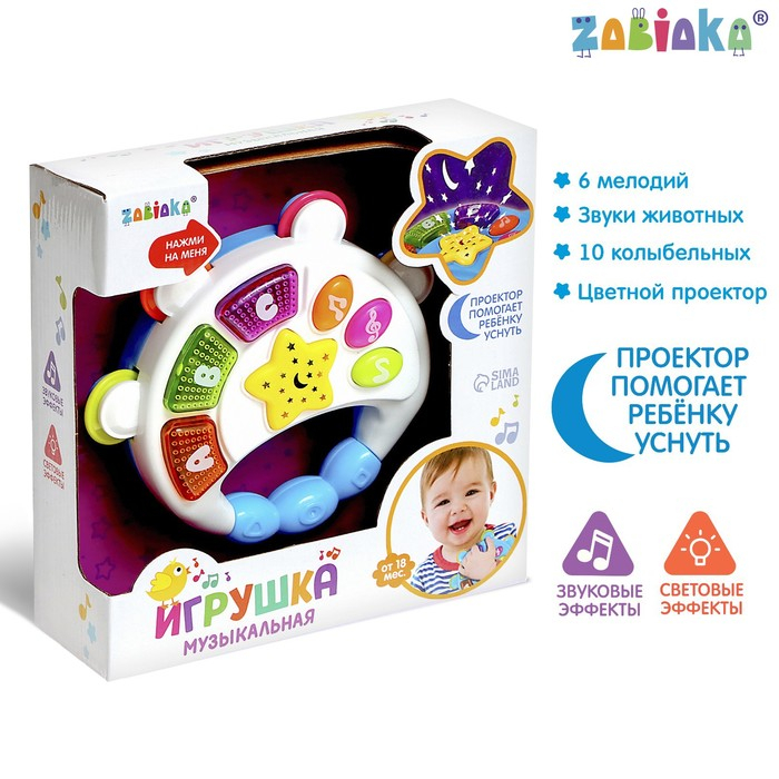 Бубен воспроизводит 6 весёлых мелодий, 10 колыбельных, звуки животных, ноты.