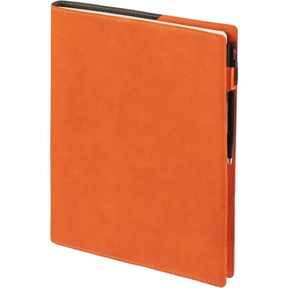 Ежедневник в суперобложке выполнен из материала La Fite, оранжевый ОО, дополнен ляссе и капталом черного цвета.