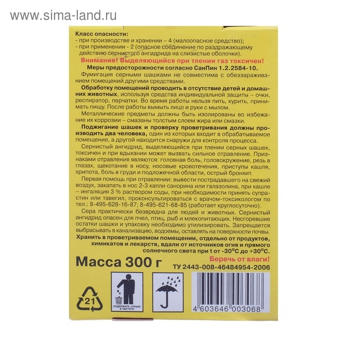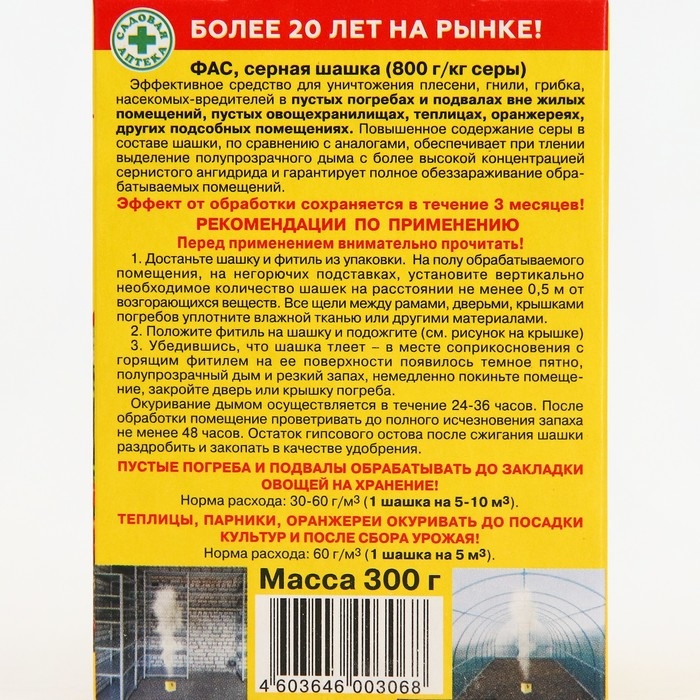 Применение: повышенное содержание серы в составе шашки обеспечивает активное горение с выделением более концентрированного дыма. Дым легко проникает во все уголки обрабатываемых помещений и позволяет гарантировать их полное обеззараживание. Пустые погреба и подвалы обрабатывать до закладки картофеля и овощей на хранении.