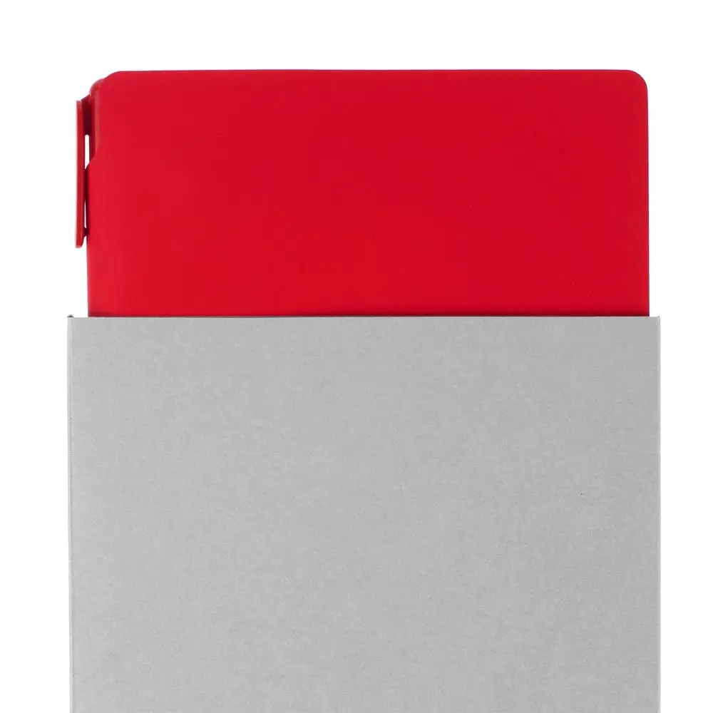 Удобный ежедневник с гибкой обложкой и местом под ручку в корешке, миниатюрная ручка из переработанного пластика и компактная самосборная коробка — простые составляющие полезного делового набора.