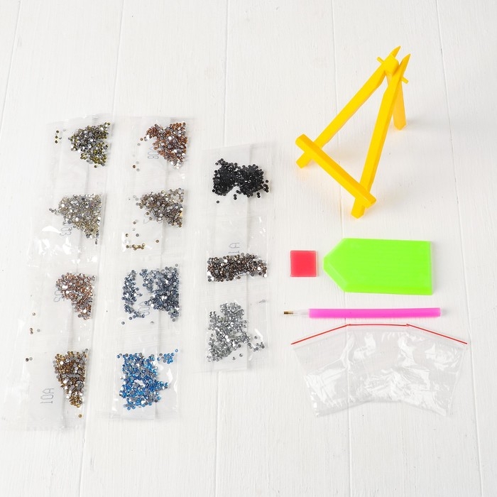 - Набор включает все необходимые материалы: картонный холст со схемой, стразы, карандаш для страз, клеевую подушечку, подставку для картины и ёмкость для страз.