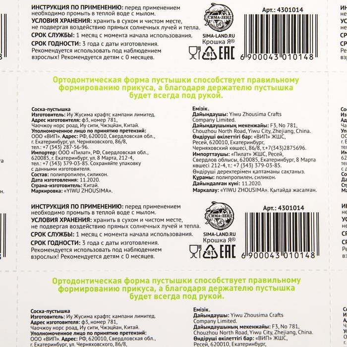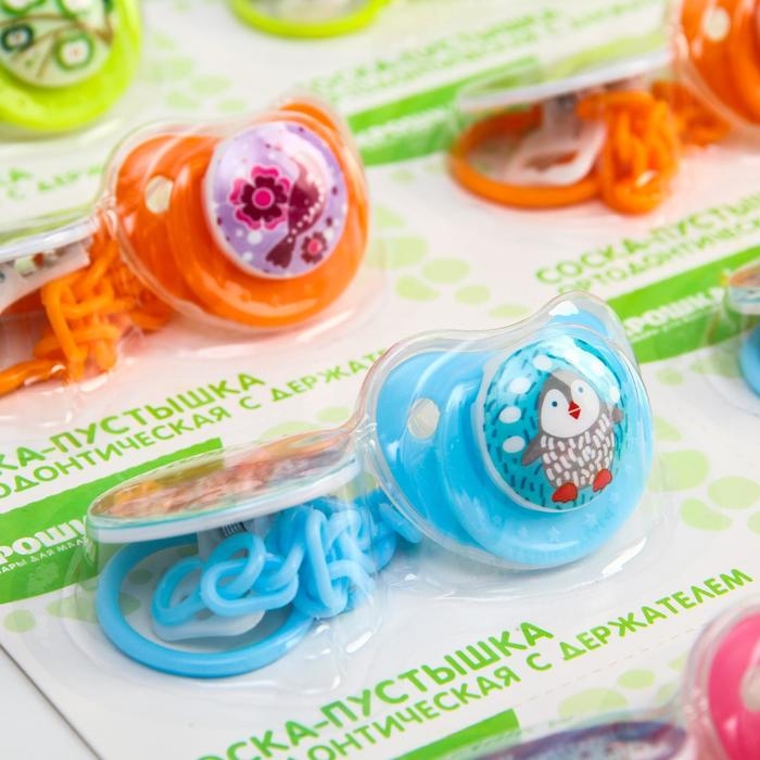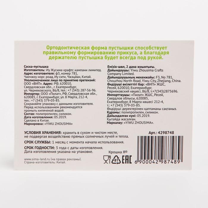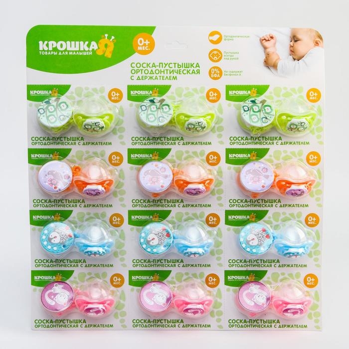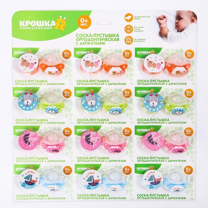 Соска - пустышка силиконовая ортодонтическая, от 0 мес., с держателем, цвет МИКС