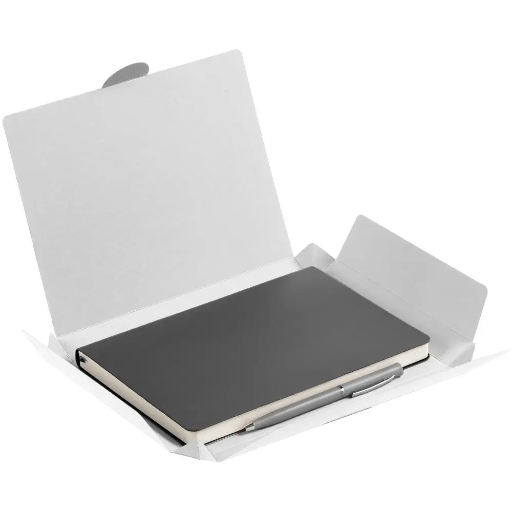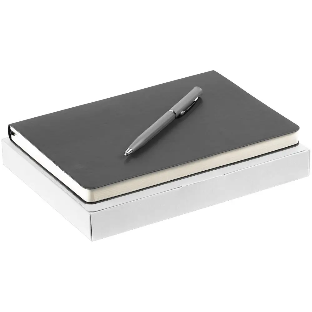 Недатированный ежедневник с гибкой обложкой из материала Latte с ляссе в цвет обложки, а также ручка в тон — в подарочной коробке из дизайнерского картона.