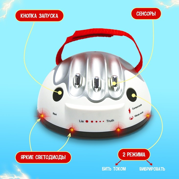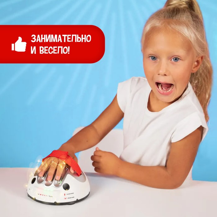 Хотите узнать маленькие секретики и страшные тайны своих друзей? Сыграйте в «Детектор лжи»! Положите руку на детектор и убедитесь, что она плотно прилегает к каждому сенсору. Зафиксируйте руку ремешком. Выберите режим игры. После 1 звукового сигнала включается режим игры с вибрацией, после 2 – с током.