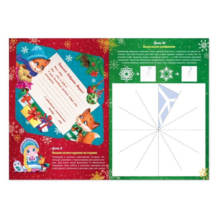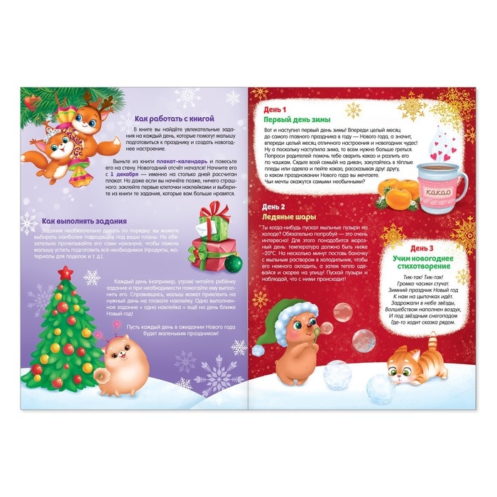 В течение всего декабря малыш будет выполнять задания и отмечать даты в календаре с помощью наклеек. Ребёнок напишет письмо Деду Морозу, раскрасит картинки, расшифрует слова, преодолеет лабиринты.