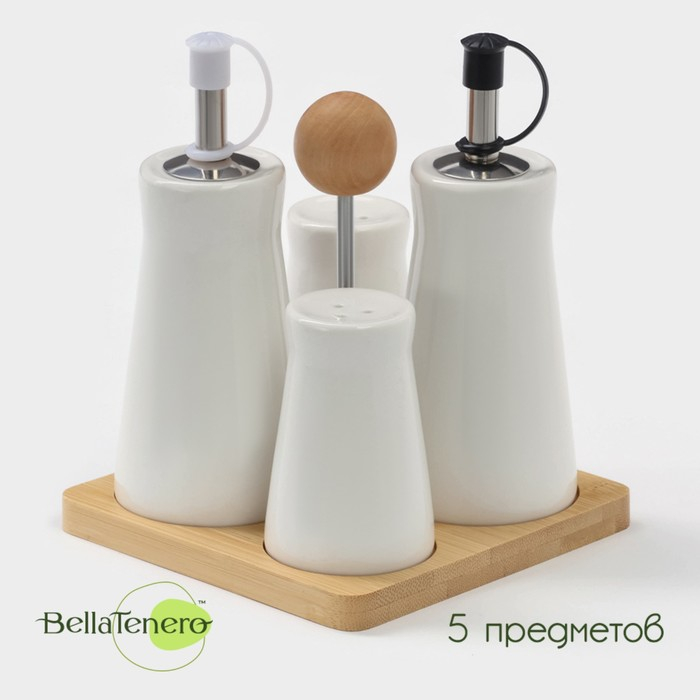 Набор фарфоровый для специй BellaTenero, 5 предметов: солонка 50 мл, перечница 50 мл, сахарница с ложкой 200 мл, подставка-держатель, цвет белый
