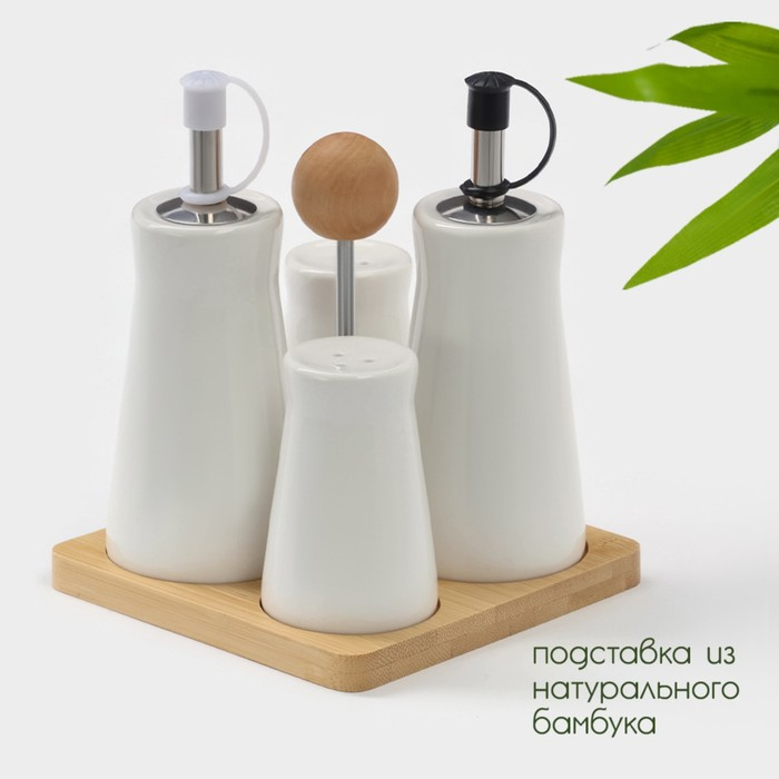 Набор для специй на деревянной подставке BellaTenero, 4 предмета: солонка 75 мл, перечница 75 мл, салфетница, ёмкость для зубочисток, цвет белый