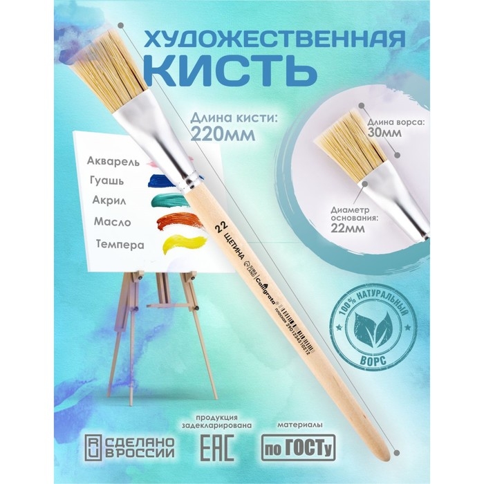 - Важным свойством является расщеплённый кончик, который способствует хорошей наполняемости кисти и ровному нанесению краски. Изделия предназначены для работ с "тяжёлыми красками": маслом, акрилом, темперой, гуашью. Натуральные кисти из щетины – отличный инструмент как для детского и школьного творчества, так для хобби и профессиональной живописи.