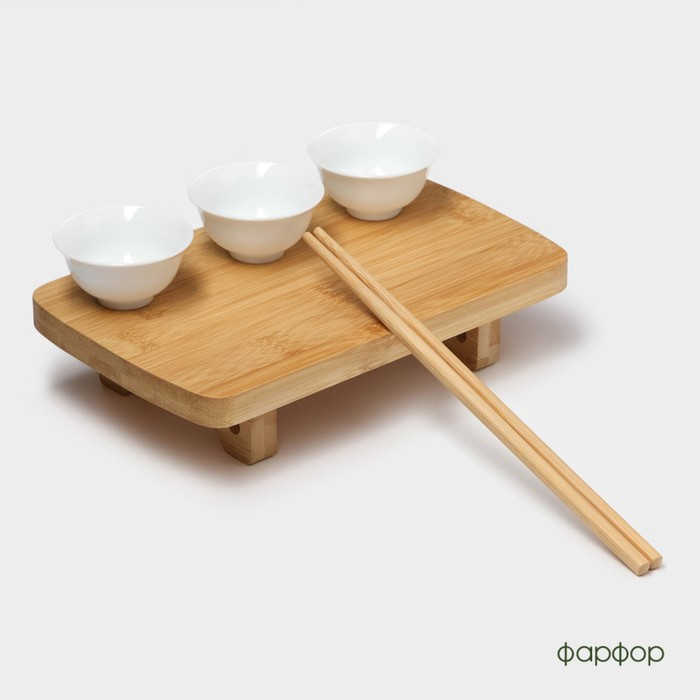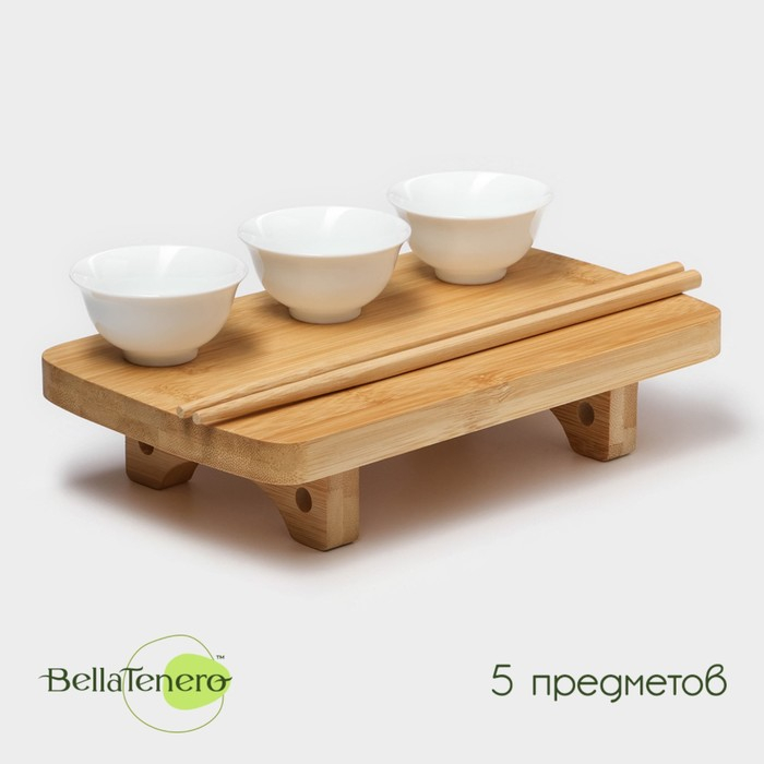 Набор фарфоровый сервировочный на бамбуковой подставке BellaTenero, 5 предметов: 3 соусника, палочки, подставка