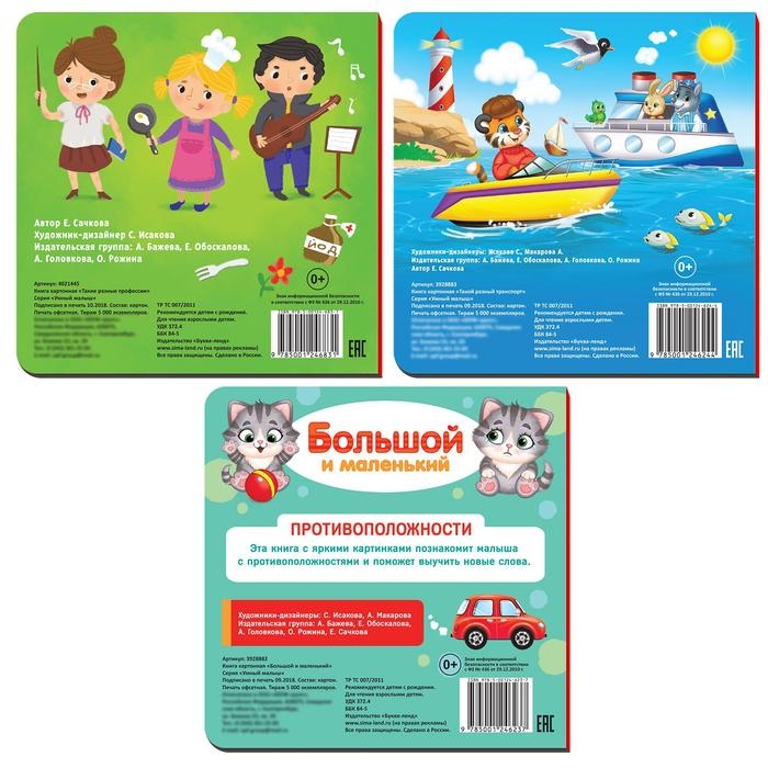 В комплекте 3 книги с несколькими тематиками: профессии, большой-маленький, транспорт.