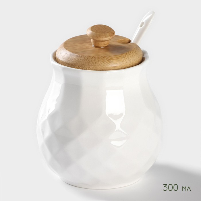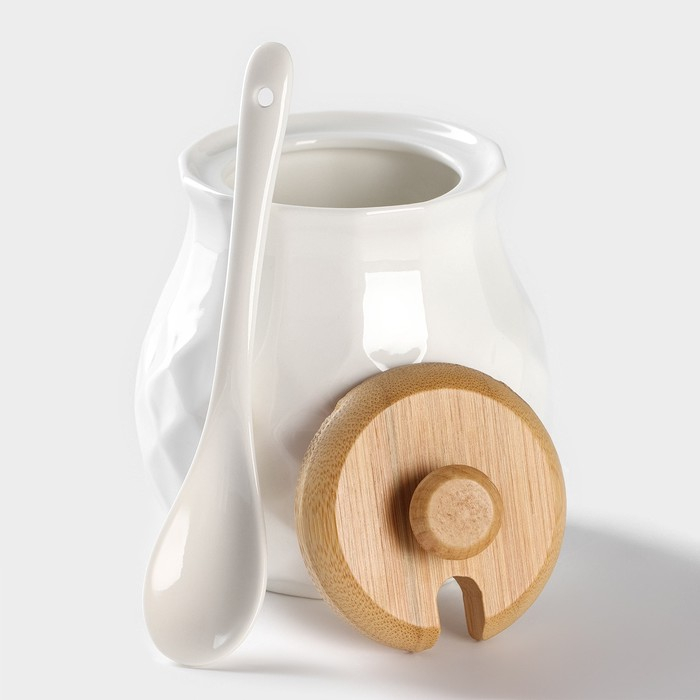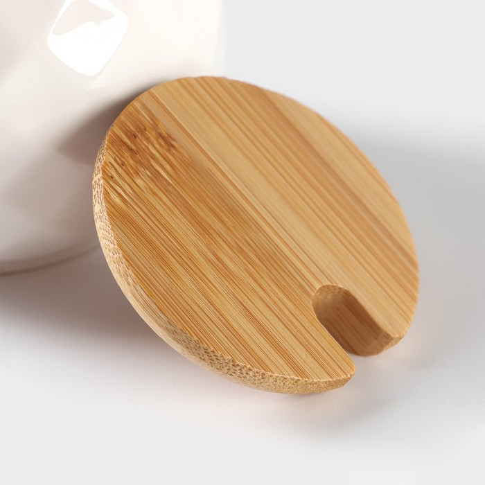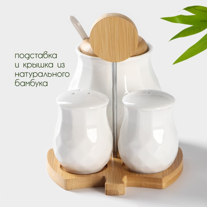 Набор фарфоровый для специй на бамбуковой подставке BellaTenero, 3 предмета: солонка 150 мл, перечница 150 мл, сахарница с ложкой 300 мл, цвет белый