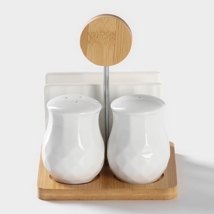 Набор для специй на деревянной подставке BellaTenero, 4 предмета: солонка 75 мл, перечница 75 мл, салфетница, ёмкость для зубочисток, цвет белый
