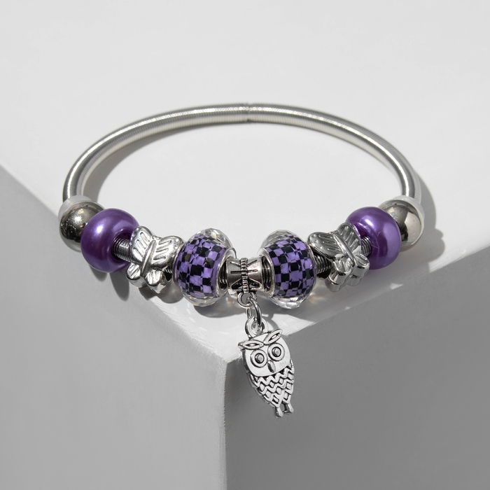 Браслет ассорти "Марджери" сова, цвет фиолетово-чёрный в серебре, d=6,5 см