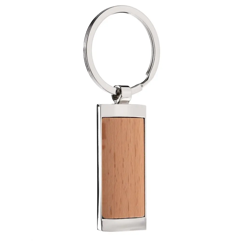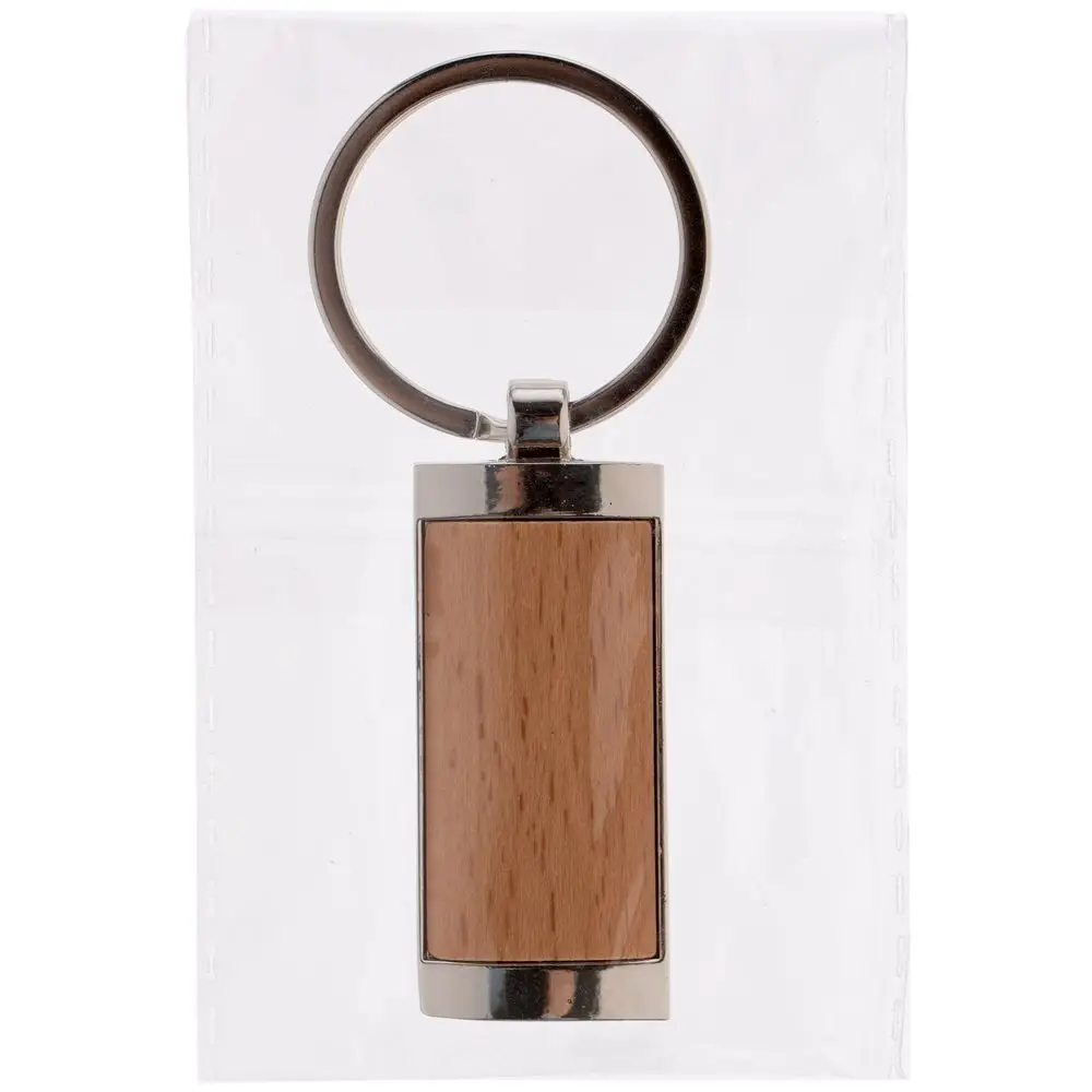 Металлический прямоугольный брелок с деревянной вставкой.