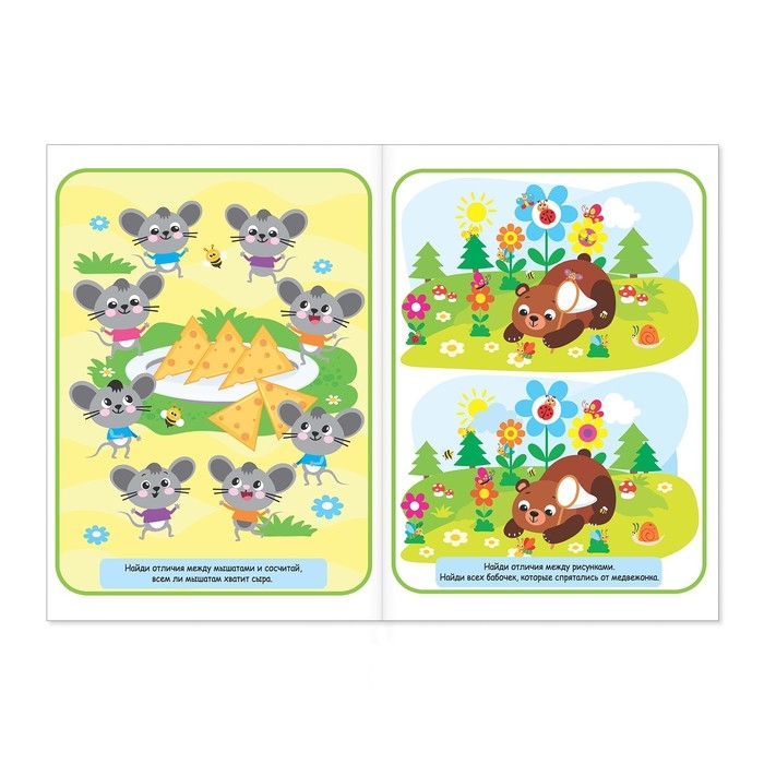 На каждой странице представлены яркие, красочные картинки лесных животных, домашних питомцев, птичек, рыбок, космических ракет и много всего интересного. Отличия между ними лишь в нескольких деталях. Дополнительно в книжке представлены задания: дорисовать и раскрасить картинки. Одно и то же задание можно выполнять несколько раз, улучшая свой результат.