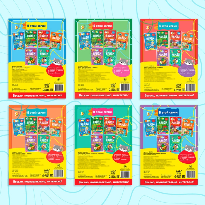 Книга «Найди отличия» — это комплекс типовых детских упражнений, представленных в наборе шести изданий. Упражнения развивают у ребёнка память, скорость реакции, смекалку, воображение, внимание, мелкую моторику рук, визуальное восприятие.