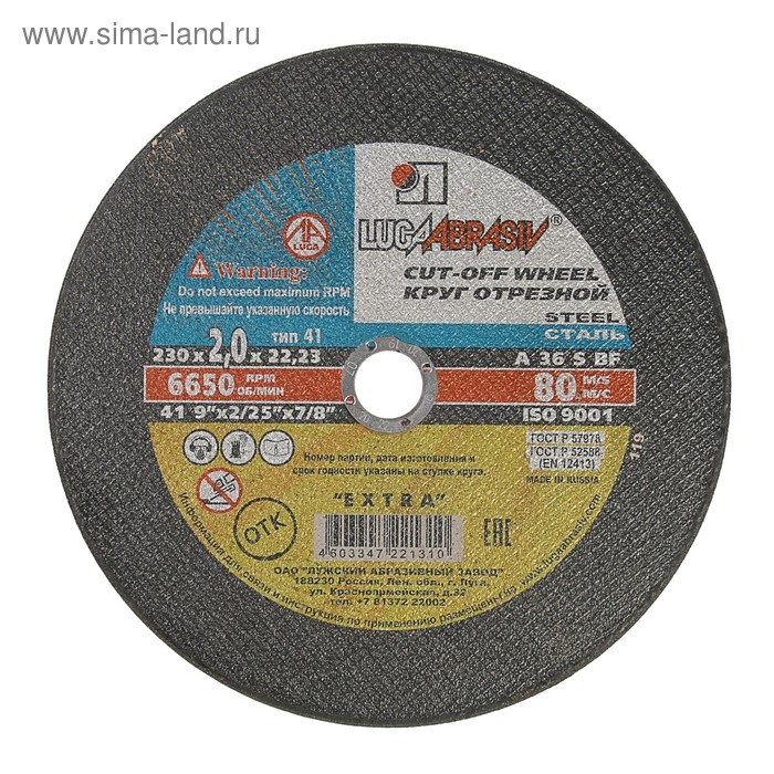 Круг отрезной по металлу "Луга", A 36 S BF 80, 14 А БУ, 230х2х22 мм
