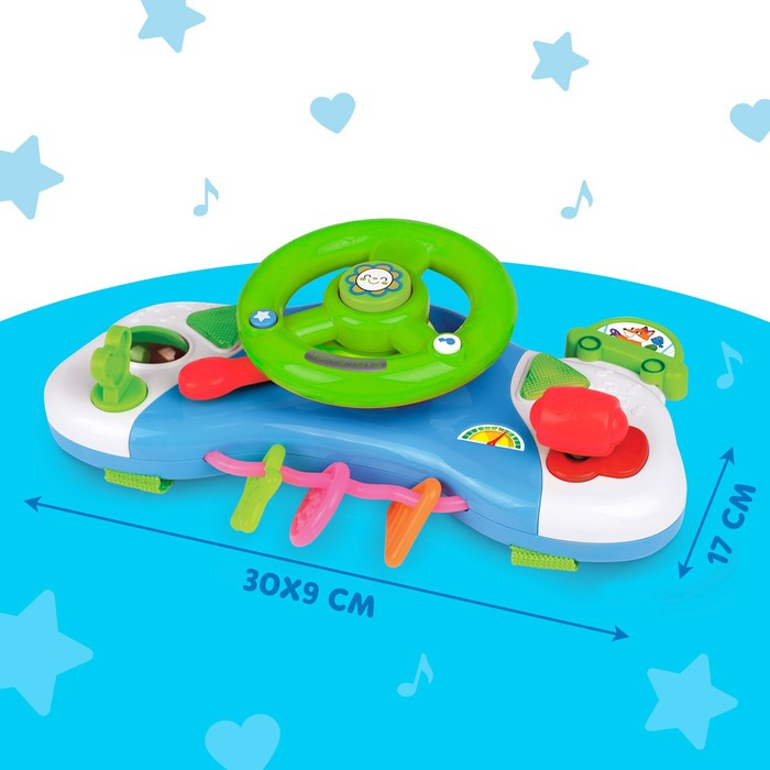 Можно вращать руль, нажимать на кнопки и двигать детали. Мигающие огоньки на корпусе и интересные звуки привлекут внимание малыша.