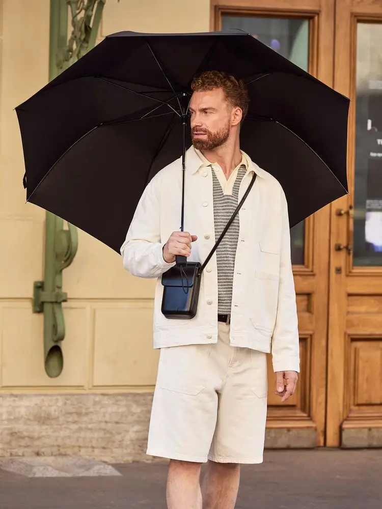 - Пластиковая матовая эргономичная ручка с эластичной петлей и кнопкой автоматического открывания зонта