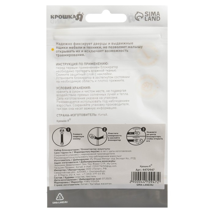 Набор блокираторов для дверей и ящиков, универсальные, 17 см, 2 шт., цвет белый/прозр, Крошка Я