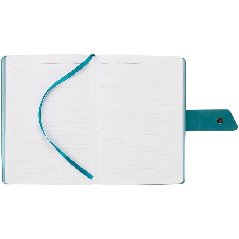 Ежедневник с гибкой обложкой, выполнен из материала La Fite, черный АА и Nubuck, цвет морской волны II, дополнен бирюзовым ляссе и хлястиком на кнопке.