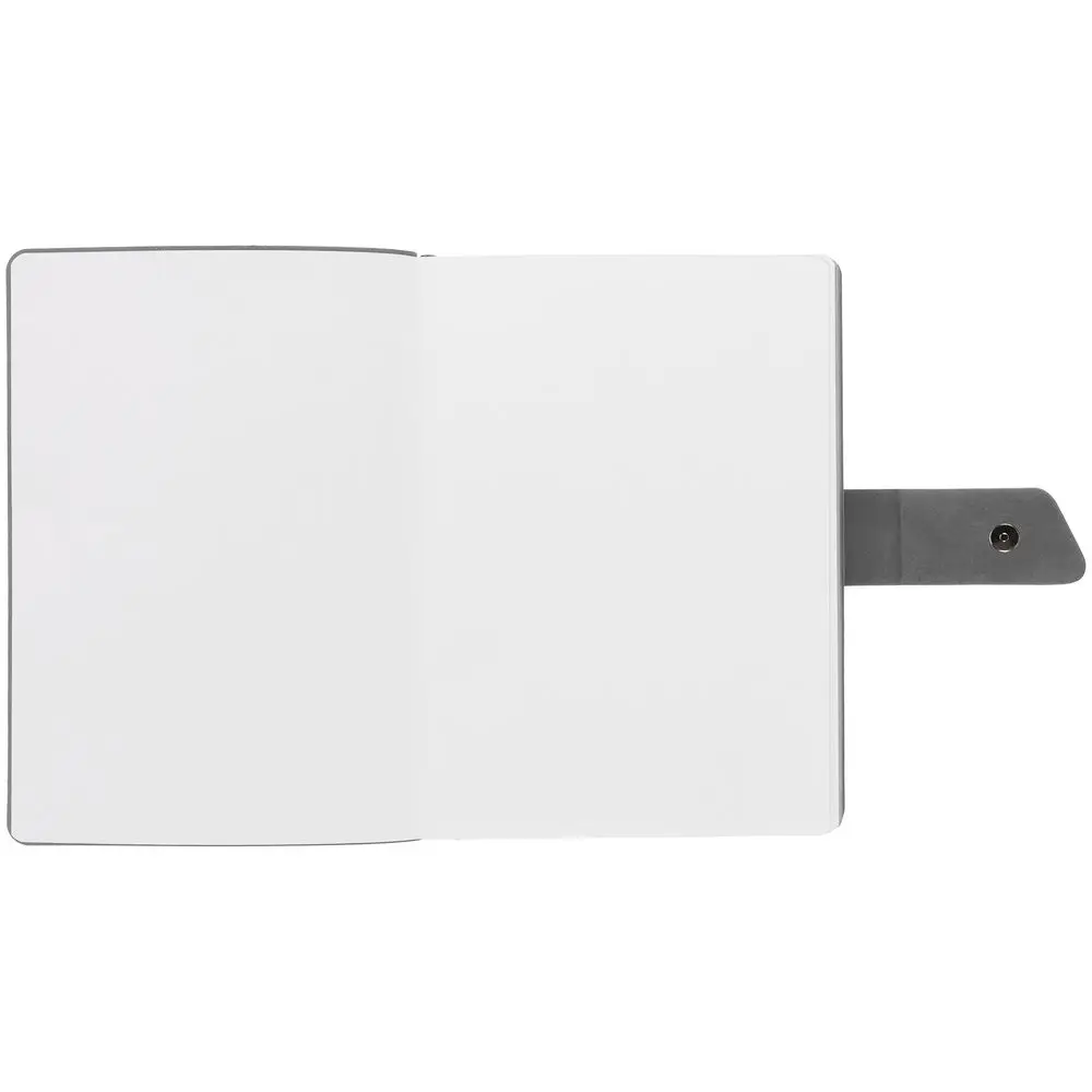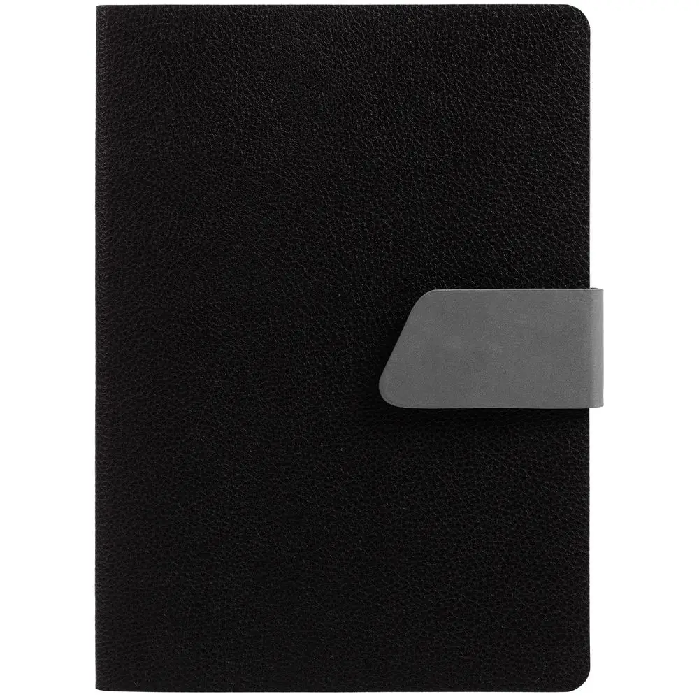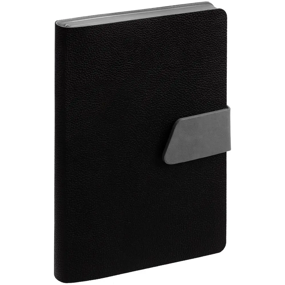 Ежедневник с гибкой обложкой, выполнен из материала La Fite, черный АА и Nubuck, серый СС, дополнен серым ляссе и хлястиком на кнопке.