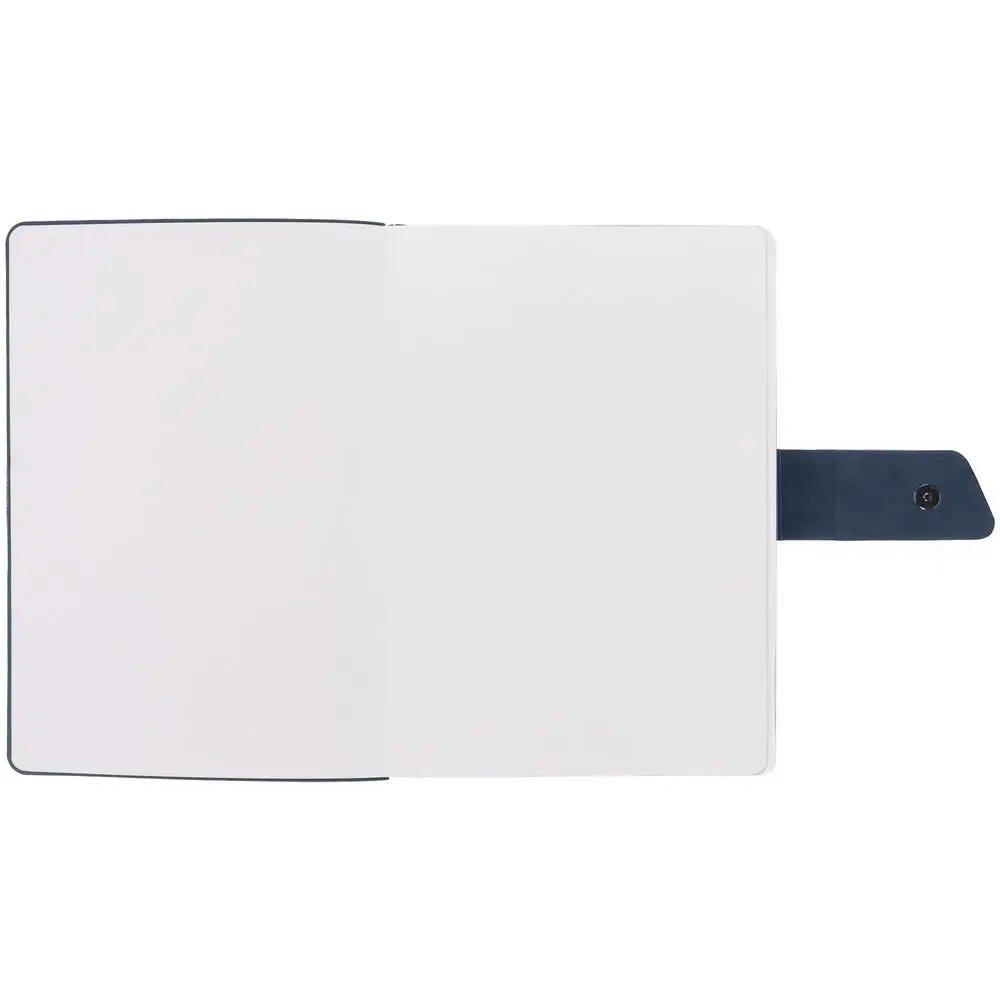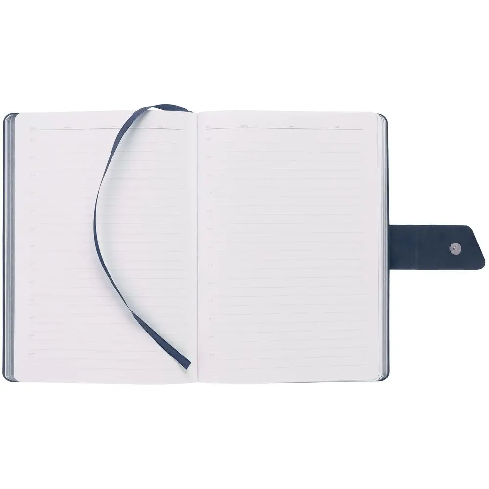 Ежедневник с гибкой обложкой, выполнен из материала La Fite, черный АА и Nubuck, темно-синий ХХ, дополнен синим ляссе и хлястиком на кнопке.