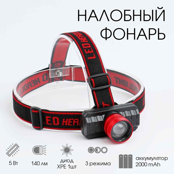 Фонарь налобный аккумуляторный, 10 Вт, 1000 мАч, 200 лм, LED, IPX3