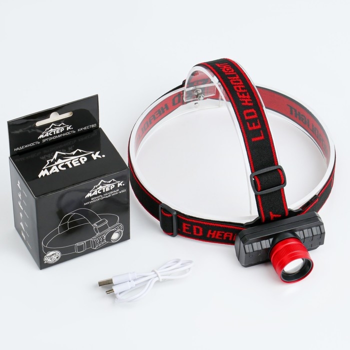 Фонарь налобный аккумуляторный "Мастер К", 5 Вт, 140 лм, XPE, 3 режима, 7 x 5 x 3.5 см, USB