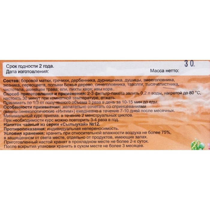 Способ применения: 2-3 фильтр-пакета залить 0,2 л воды, нагретой до 80 град., настоять 30 мин. при комнатной температуре, отжать. Принимать по 1/3 стакана 3 раза в день за 10-15 мин до еды. Минимальный курс приема: в течение 2 менструальных циклов. При необходимости курс можно повторять 3-4 раза в год.