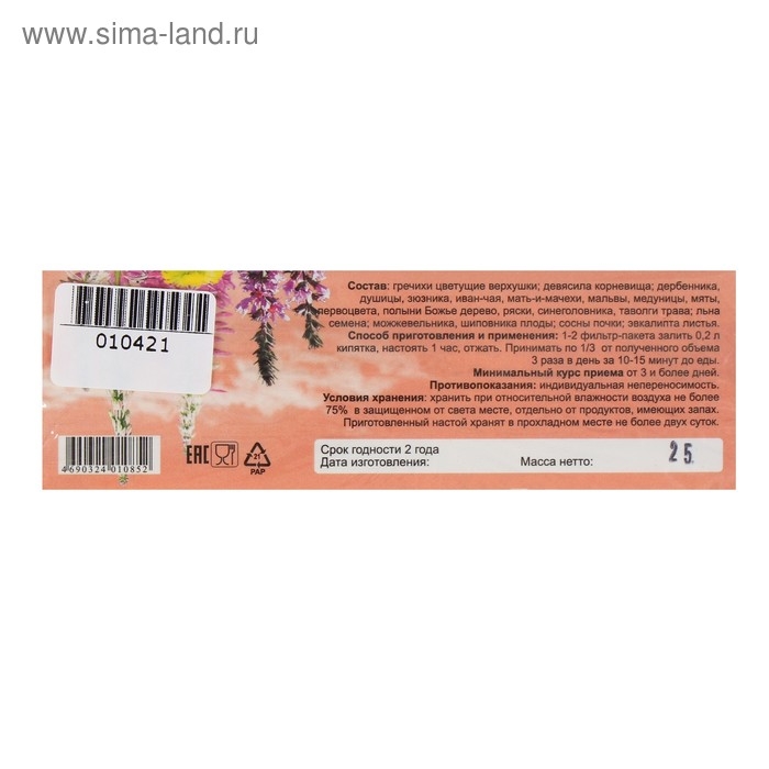 Состав: гречихи цветущие верхушки, девясила корневища, дербенника, душицы, зюзника, иван-чая, мать-и-мачехи, мальвы, медуницы, мяты, первоцвета, полыни Божье дерево, ряски, синеголовника, таволги трава, льна семена, можжевельника, шиповника плоды, сосны почки, эвкалипта листья.