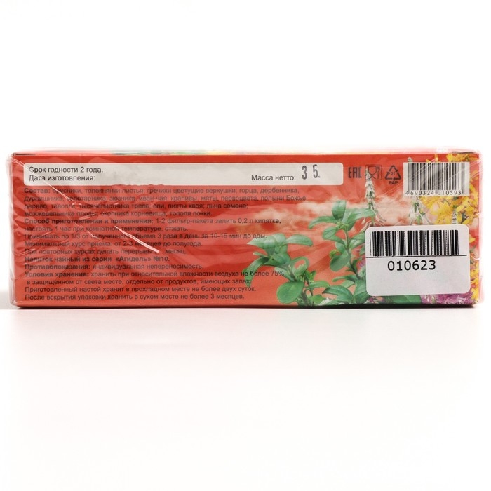 Состав: брусники, толокнянки листья, гречихи цветущие верхушки, горца, дербенника, дурнишника, золотарника, зюзника, иван-чая, крапивы, мяты, первоцвета, полыни Божье дерево, таволги, тысячелистника трава, ели, пихты хвоя, льна семена, можжевельника плоды, окопника корневища, тополя почки.