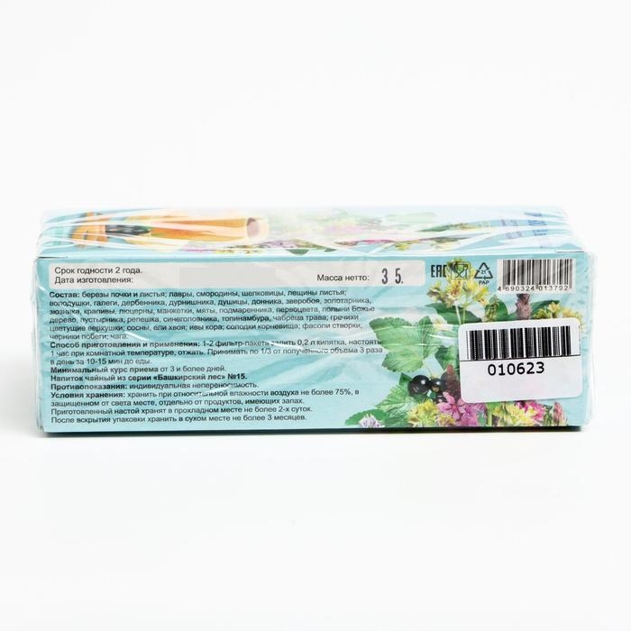 Состав: почки березы, березы, лавра, смородины, шелковицы листья, володушки, галеги, дербенника, дурнишника, душицы, донника, зверобоя, золотарника, зюзника, крапивы, люцерны, манжетки, мяты, первоцвета, подмаренника, полыни Божье дерево, пустырника, репешка, синеголовника, топинамбура, цикория, чабреца трава; гречихи цветущие верхушки, ели, сосны хвоя, ивы кора, солодки корневища, фасоли створки, чага, черники побеги.