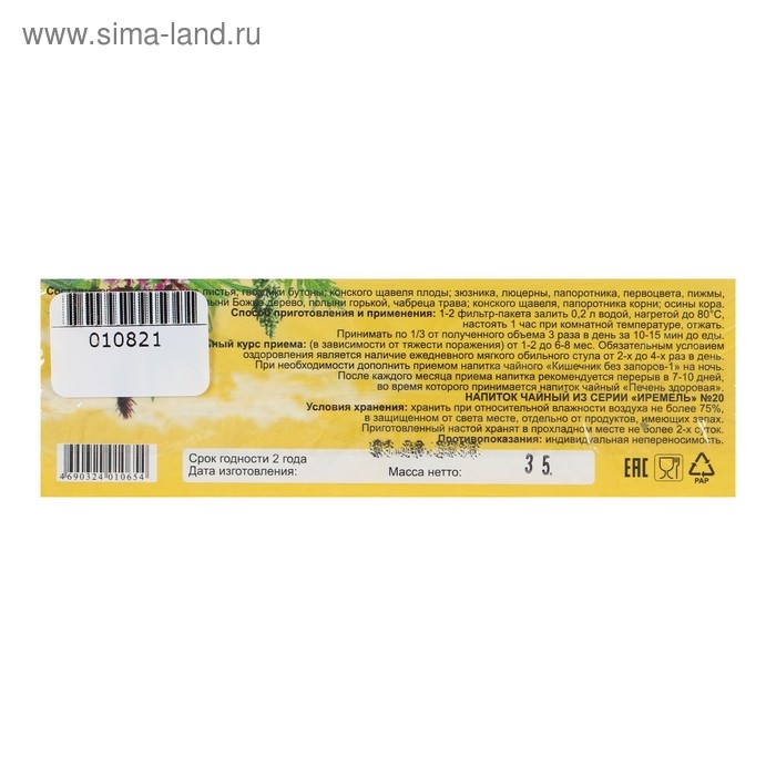 Состав: береза, листья папоротника; гвоздики бутоны, конского щавеля плоды, зюзника, люцерны, папоротника, первоцвета, пижмы, полыни Божье дерево, полыни горькой, чабреца трава, конского щавеля, папоротника корни, осины кора.