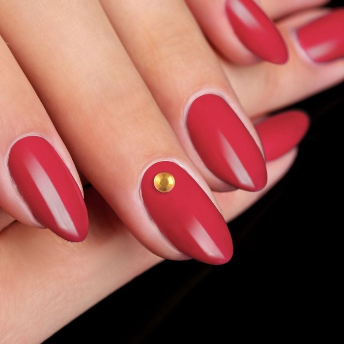 - С помощью дотса или апельсиновой палочки прикрепите стразы на высохший лак. Благодаря клеевой основе украшение не будет сползать с ногтя.