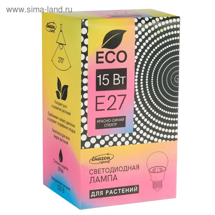 Фитолампа светодиодная Luazon, А60, E27, 15 Вт, IP44, 220 В, 270°, мультиспектральная