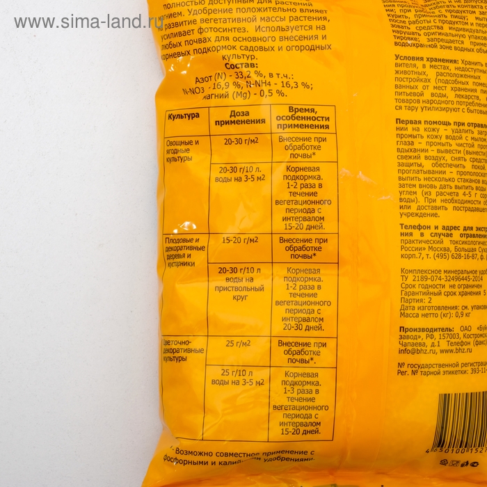 Назначение: Удобрение предназначено для развития вегетативной массы растения и усиления фотосинтеза. Используется на любых почвах для основного внесения и корневых подкормок садовых и огородных культур.