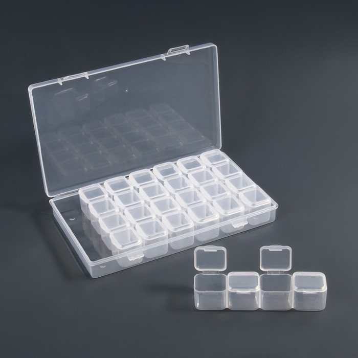 Этот компактный органайзер — идеальный помощник для хранения мелочей, которые всегда должны быть под рукой. С семью блоками, каждый из которых содержит четыре ячейки, он поможет организовать хранение страз, бисера, маникюрных украшений и других мелких элементов для декора. Прозрачные стенки позволяют легко увидеть содержимое, а плотно закрывающаяся крышка предотвращает высыпание или потерю.