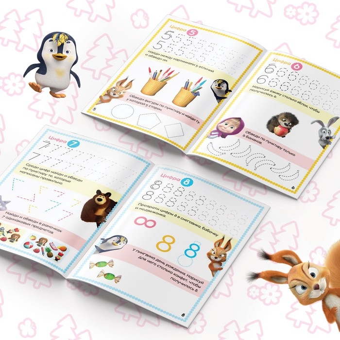 Яркие иллюстрации с любимыми героями из мультфильма «Маша и Медведь» сделают занятия веселее и интереснее.