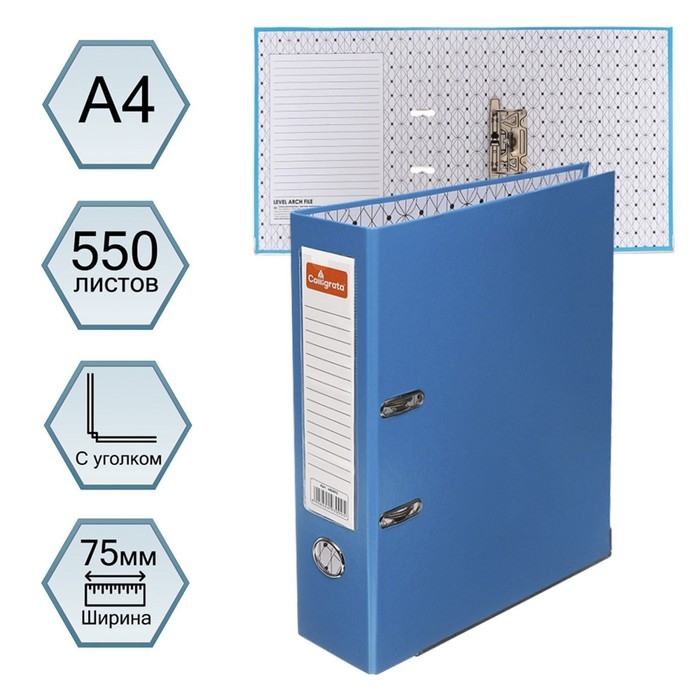 Папка-регистратор А4, 75 мм, Calligrata, ПВХ, тиснение "лен", металлическая окантовка, карман на корешок, собранная, голубая, микс
