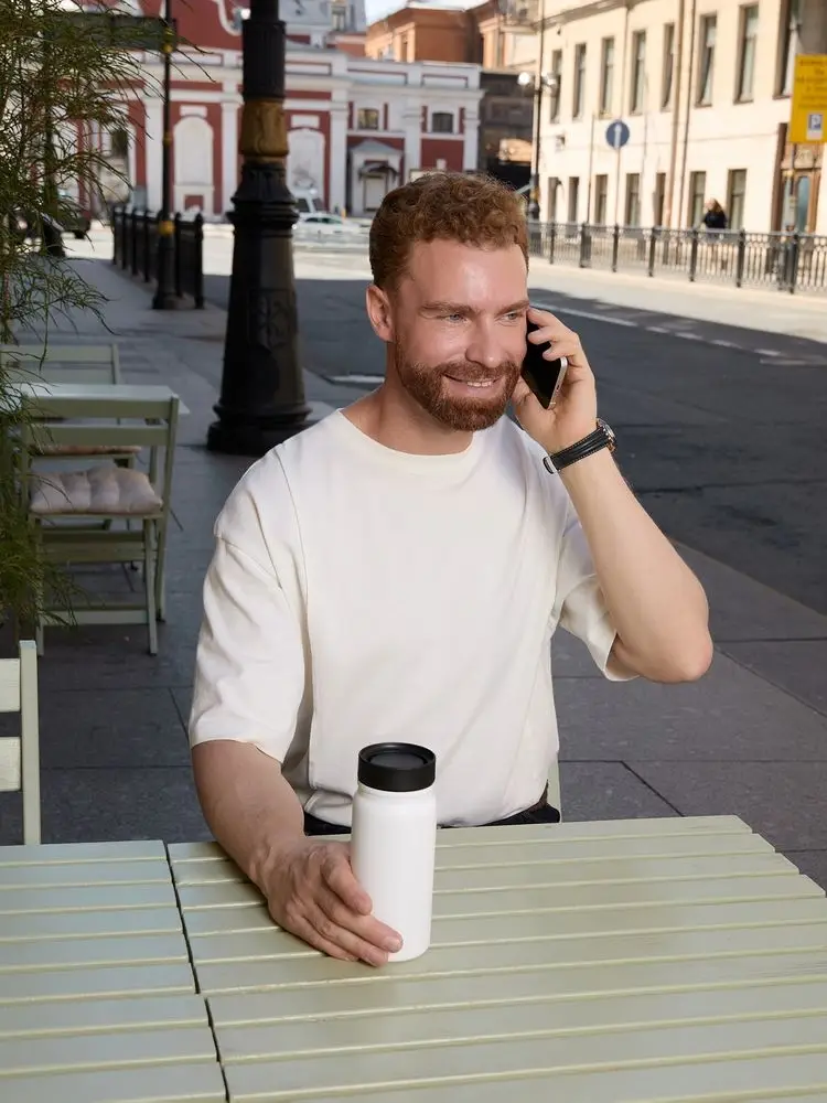 - Герметичная завинчивающаяся крышка с силиконовым уплотнителем и питьевой системой с клапаном — технология 360° позволяет одним нажатием открывать кружку и пить с любой стороны