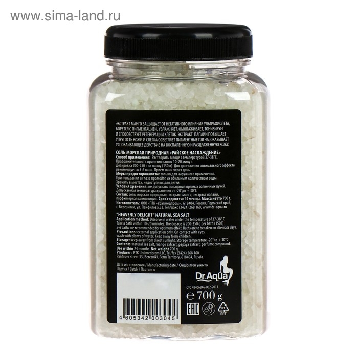 Dr.Aqua Соль морская природная для ванн Райское наслаждение 0,7кг,ПЭТ/банка