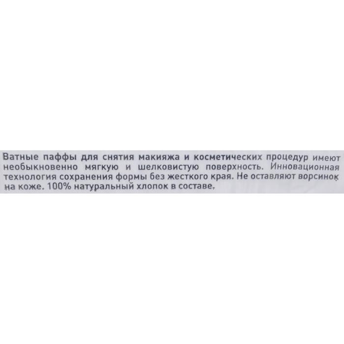 Ватные паффы для снятия макияжа и косметических процедур имеют необыкновенно мягкую и шелковистую поверхность. Инновационная технология сохранения формы без жесткого края не травмирует даже самые нежные участки кожи, такие как кожа вокруг глаз, губы. Не оставляют ворсинок на коже. 100% натуральный гигроскопический медицинский хлопок в составе. Диски удобно извлекаются из упаковки.