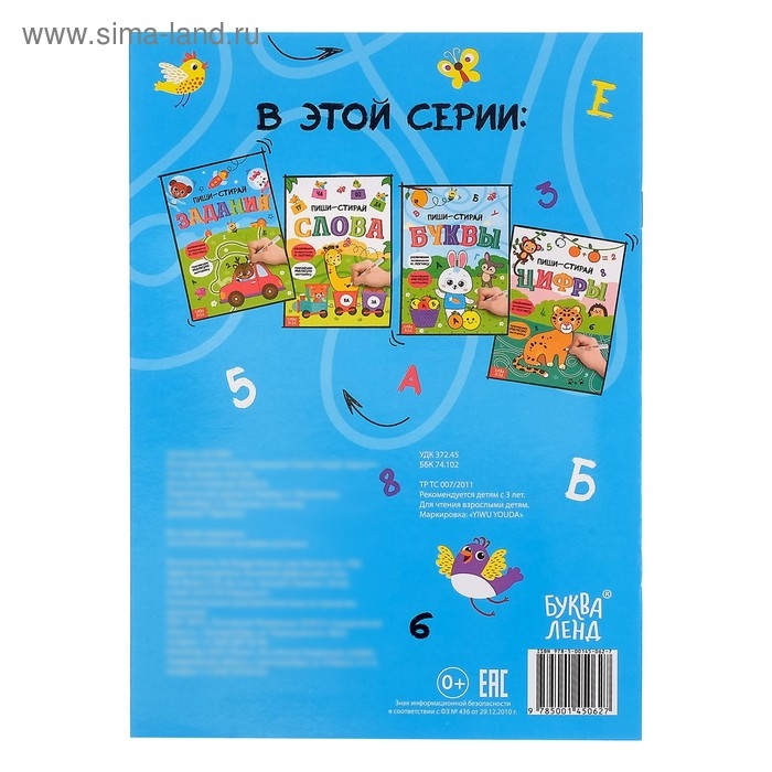 Многоразовая книга «Напиши и сотри. Цифры», 16 стр., 17 × 24 см, + маркер, Тачки